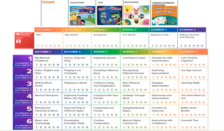 This Scheme provides clearly-sequenced units and lessons with week-by-week support for each year group. There are lesson plans, assessment documentation, a clear learning progression, as well as engaging and exciting songs and resources to support every lesson. Key Learning and Outcomes with ‘I Can’ statements are provided to be used alongside assessment grids.