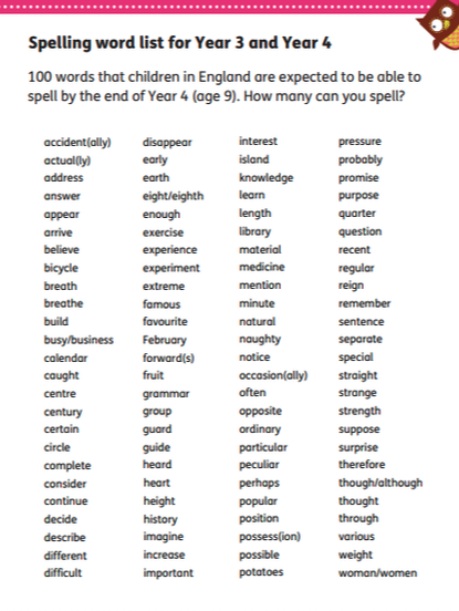 Your child will be tested on 15 spellings weekly. The first 10 are arranged by sound. There will be five that do not follow the pattern that are from the expected year group word lists (available to view on the school class webpage), or words that the class are finding tricky. The 10 words will be sent home and uploaded to the class webpage weekly.